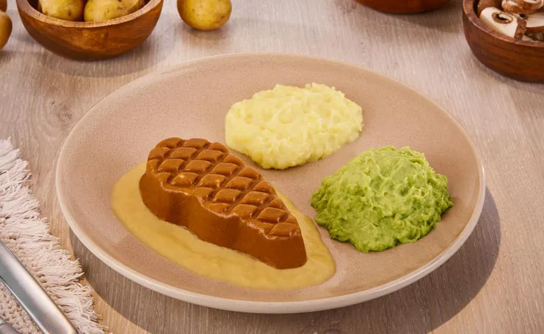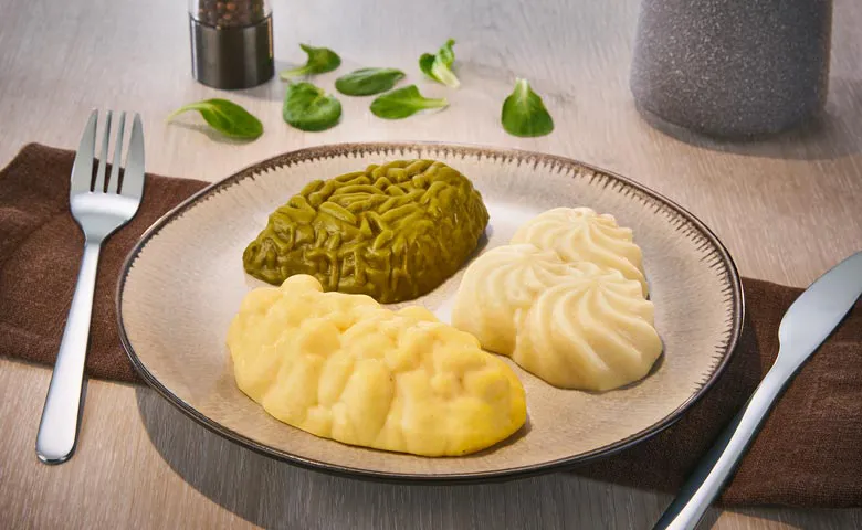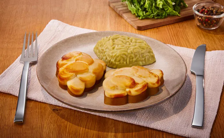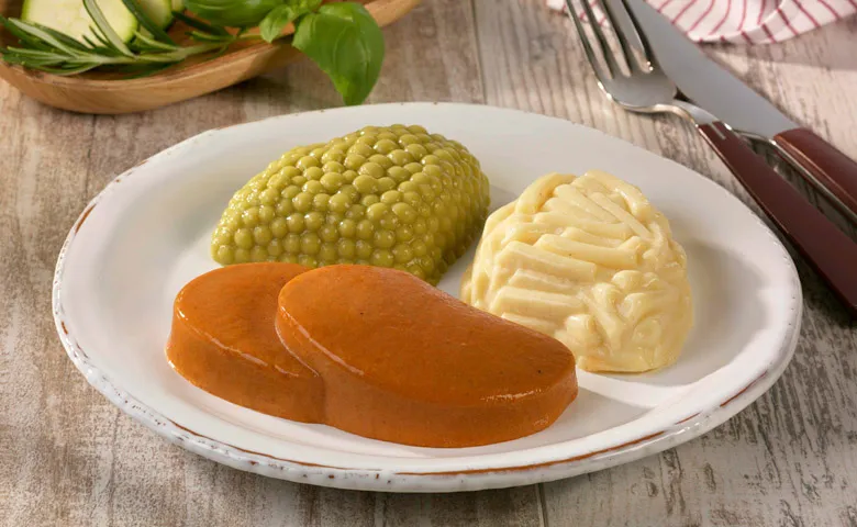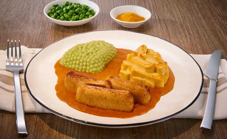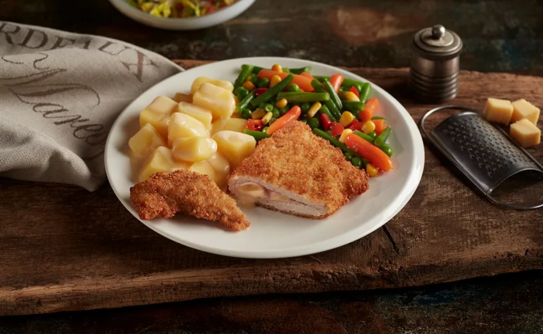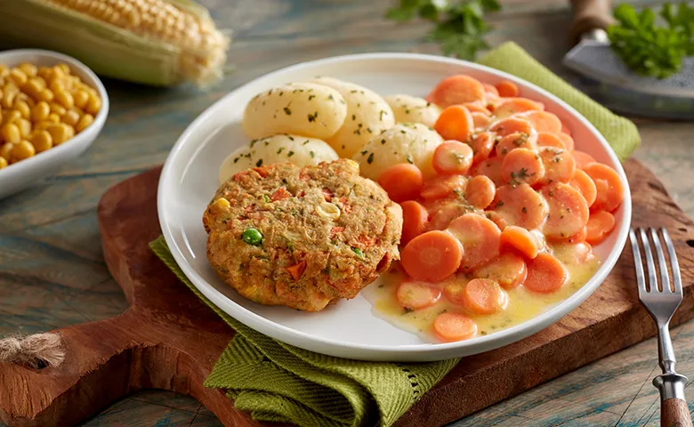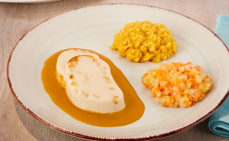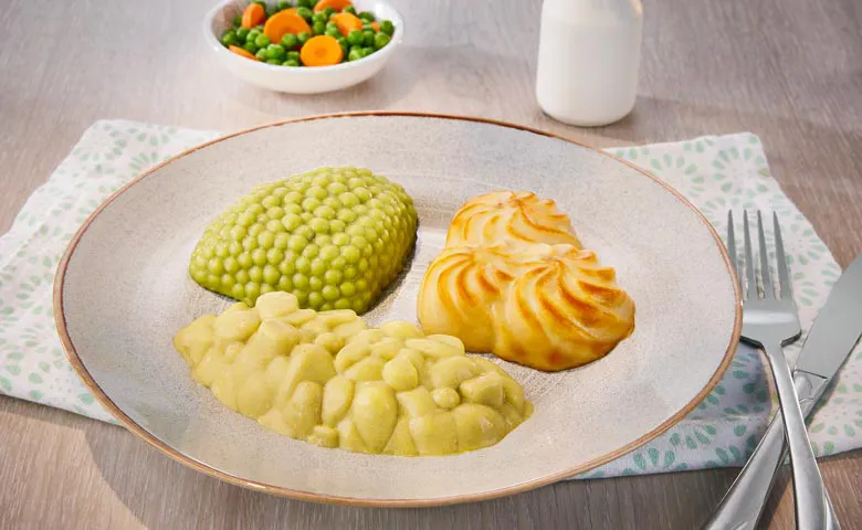 (aus Hähnchenbrustfleisch zusammengefügt), mit naturellen Erbsen und Möhren, dazu Frühlingspüree
