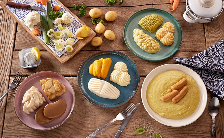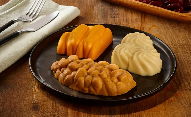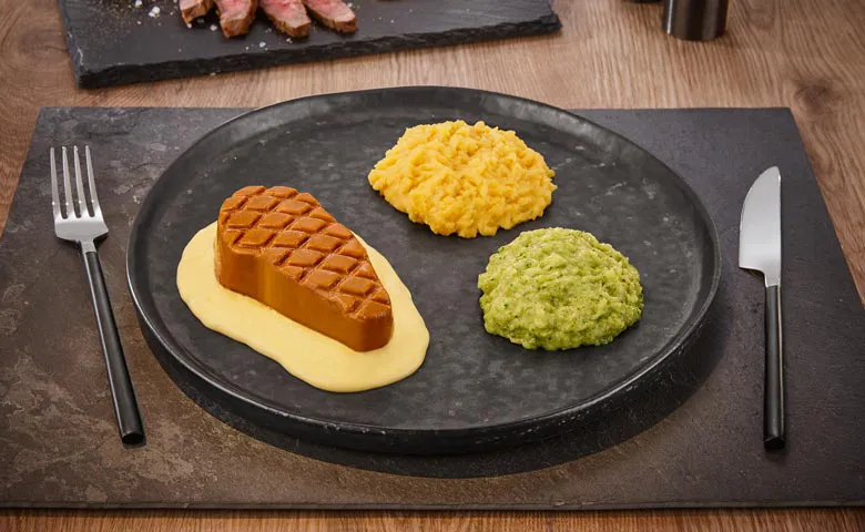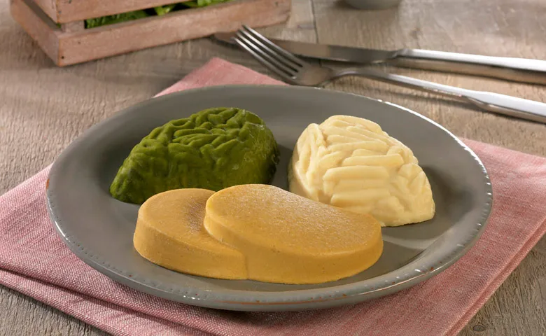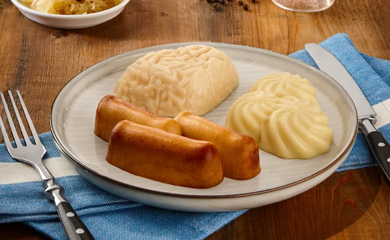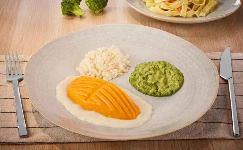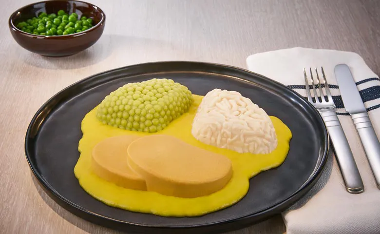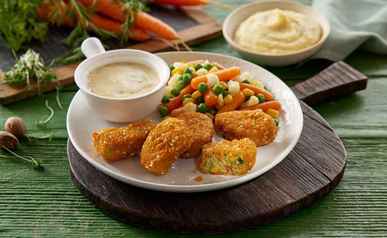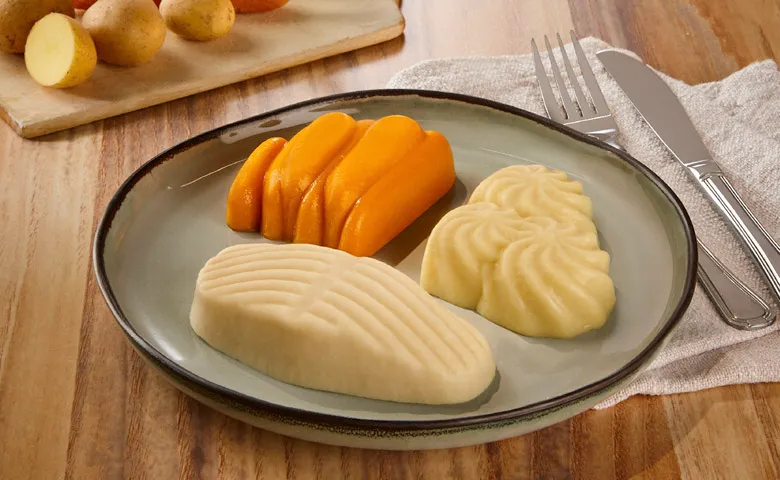 (aus Hähnchenbrustfleisch zusammengefügt), mit naturellen Erbsen und Möhren, dazu Frühlingspüree