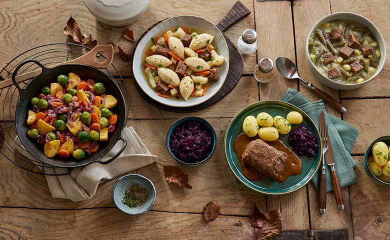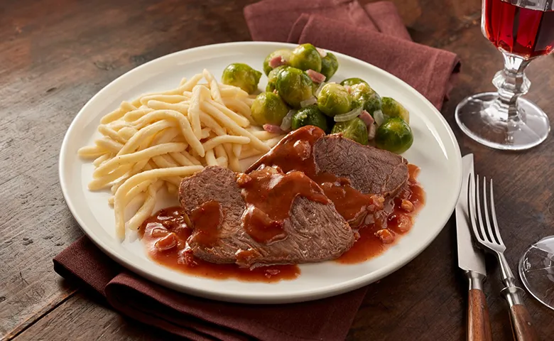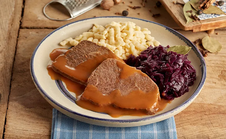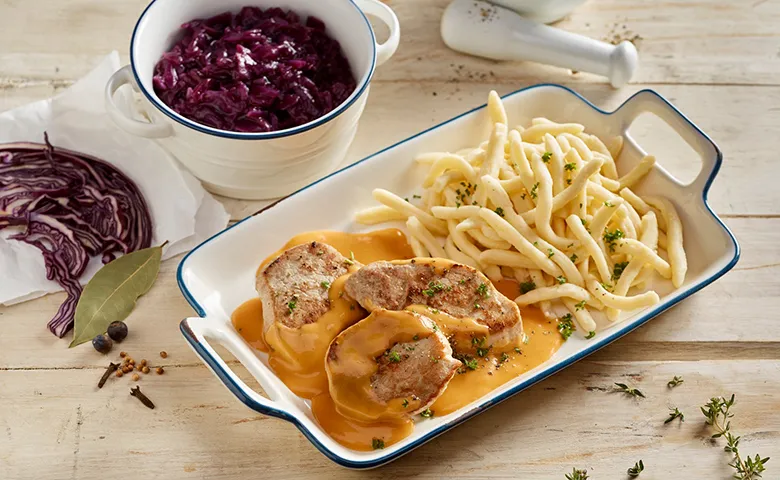 in herzhafter Soße, dazu Rotkohl und Knöpflespätzle