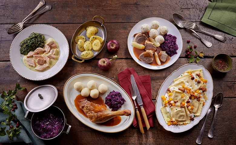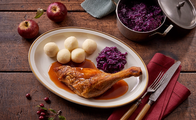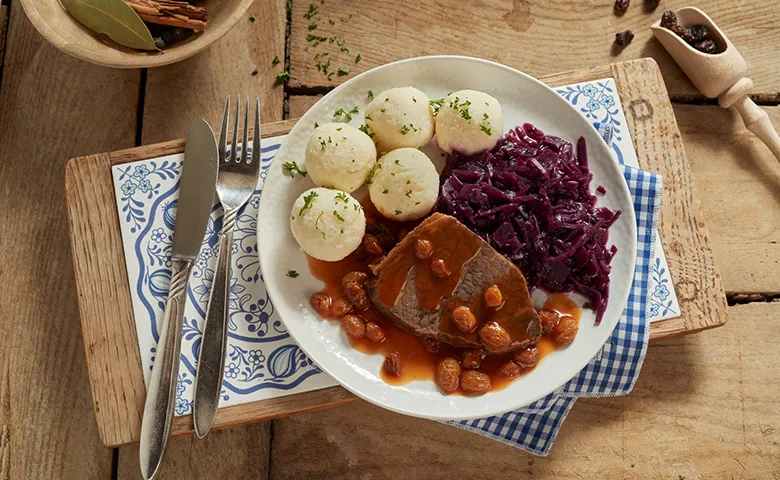 mit Rosinensoße, dazu Rotkohl und Kartoffelklöße