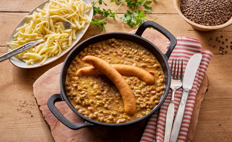 mit Bockwürstchen vom Schwein und geräuchertem Speck