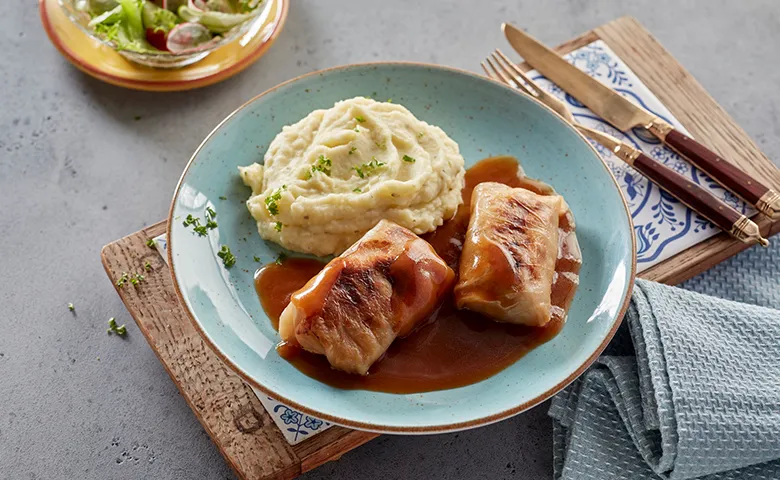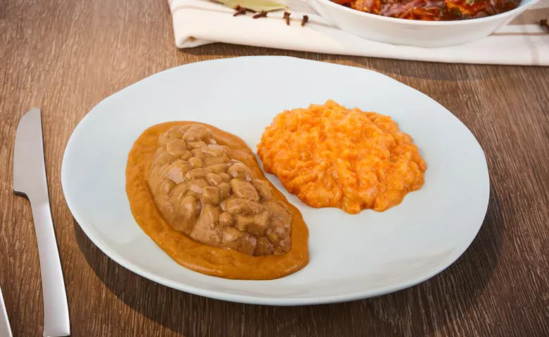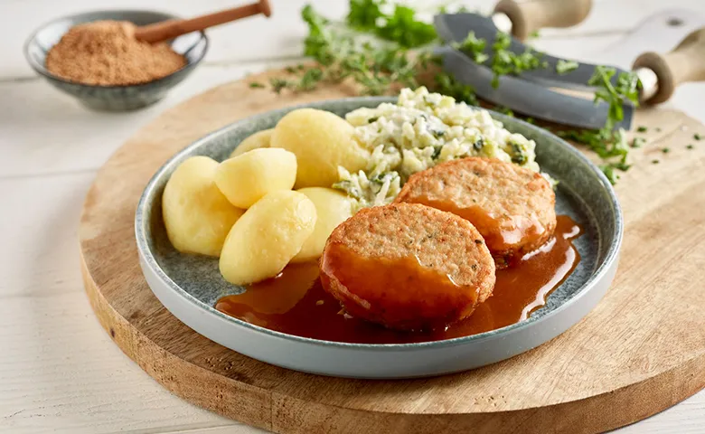 in Bratensoße, dazu Stampfkartoffeln mit Petersilie verfeinert