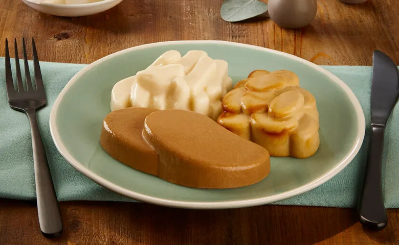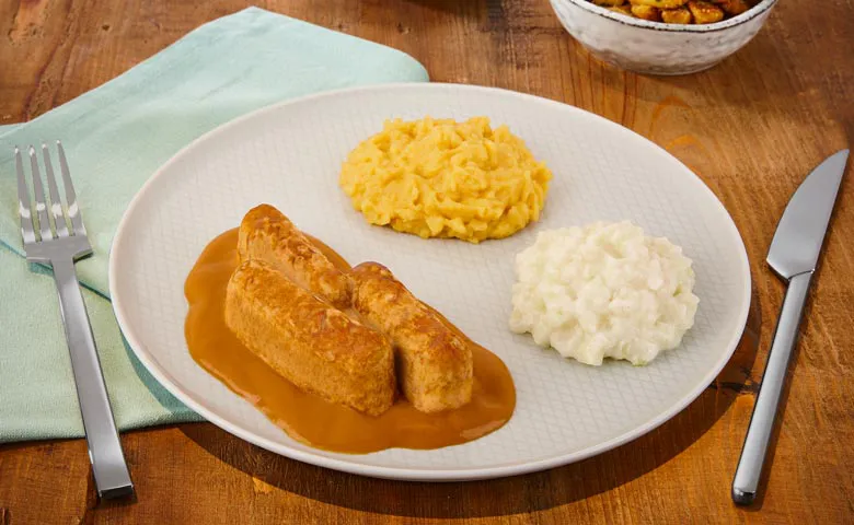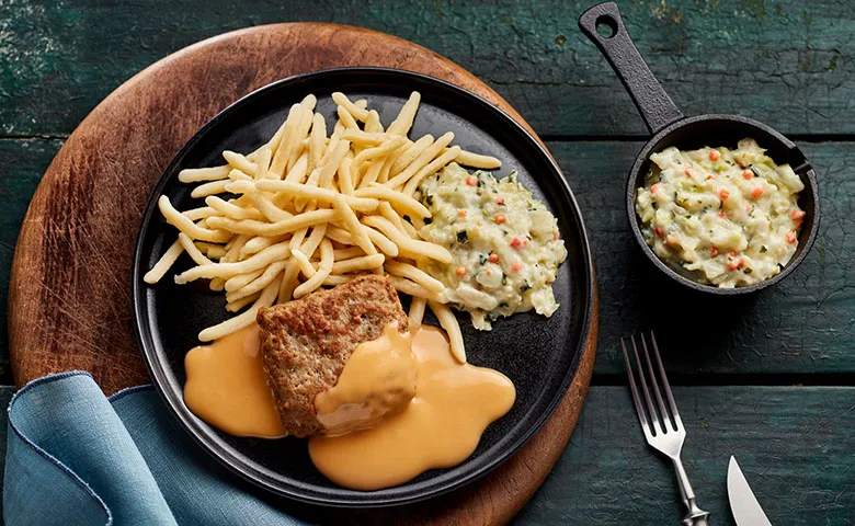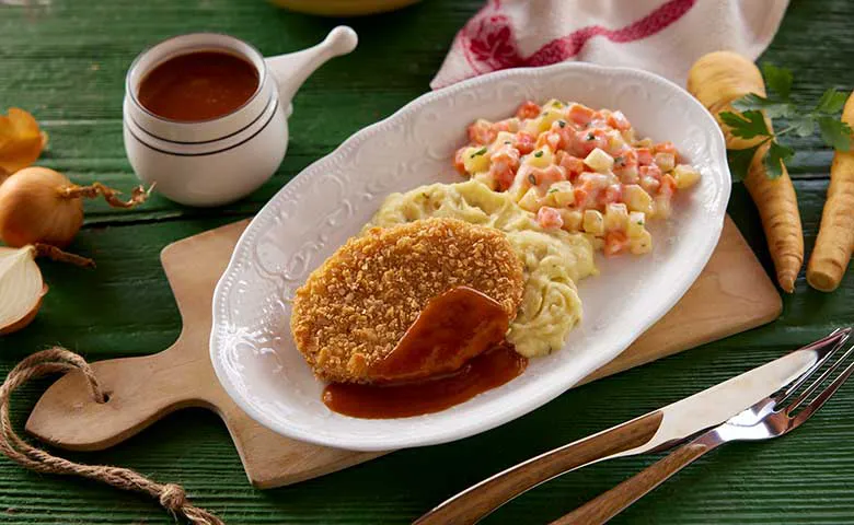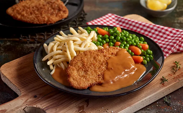 in Haferflockenpanade mit dunkler Soße, dazu Rübengemüse und Zwiebel-Kartoffelstampf