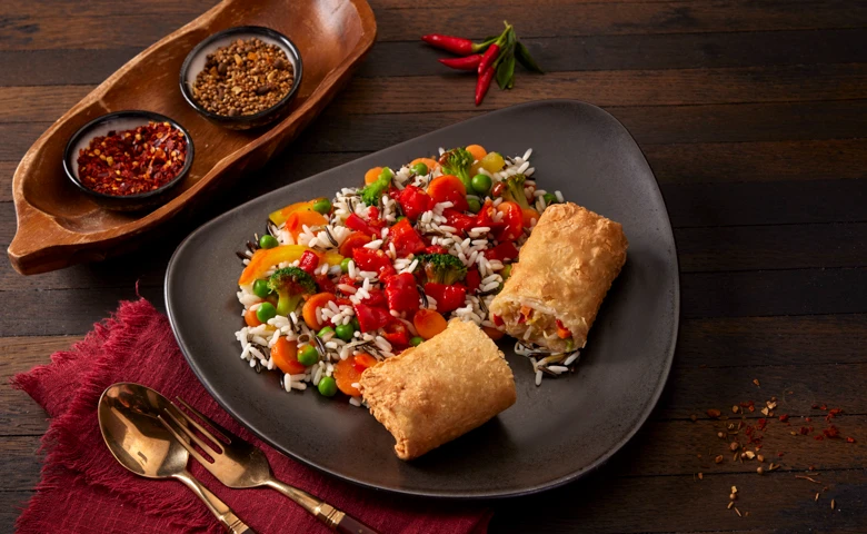 Zarte Rindfleischstreifen in feuriger Soße mit Gemüse, dazu Thai-Reis
