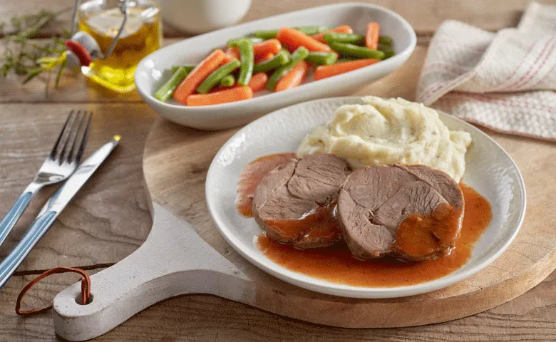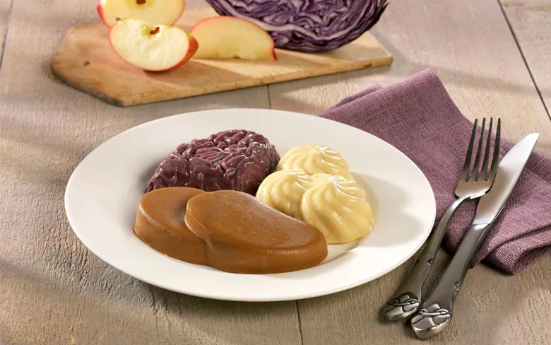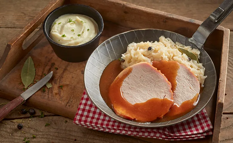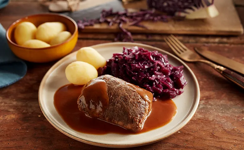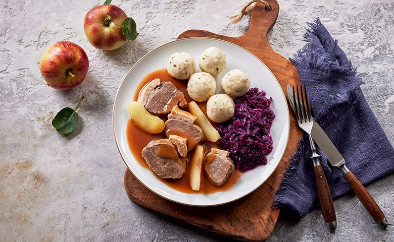 in herzhafter Bratensoße mit Apfelrotkohl und Salzkartoffeln