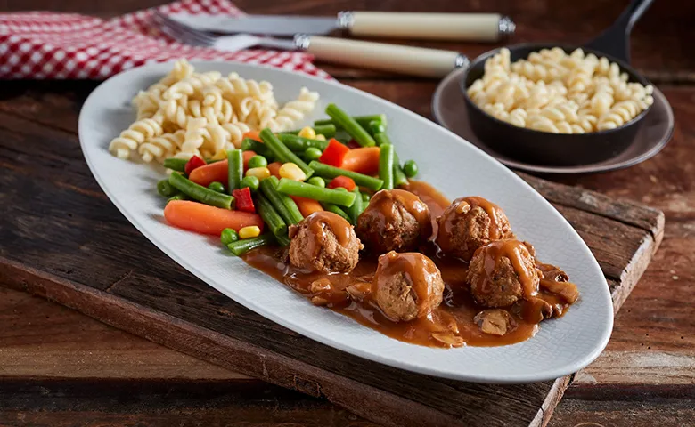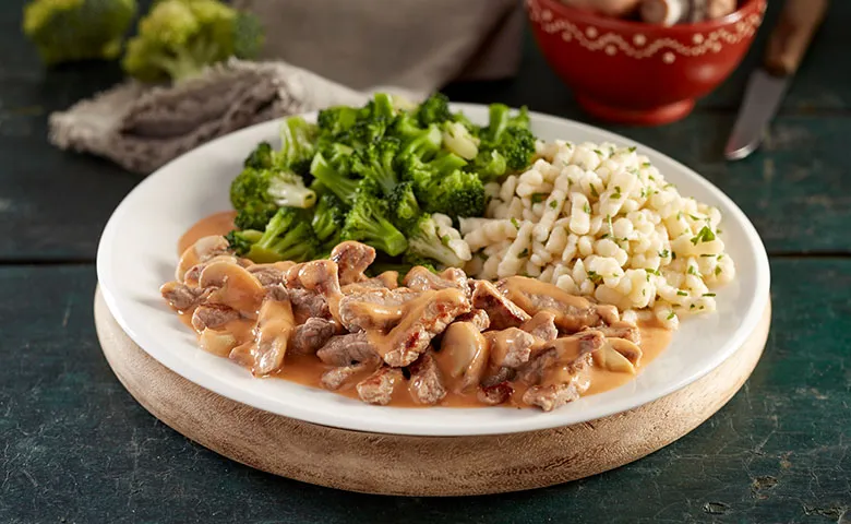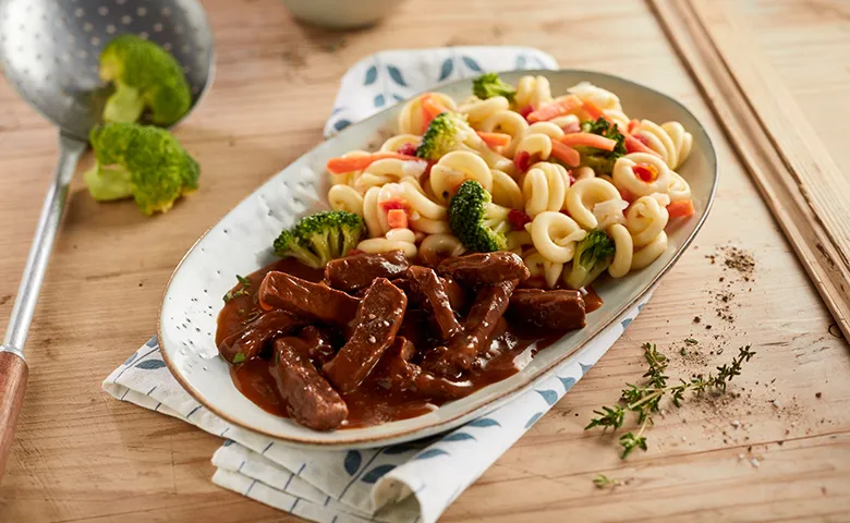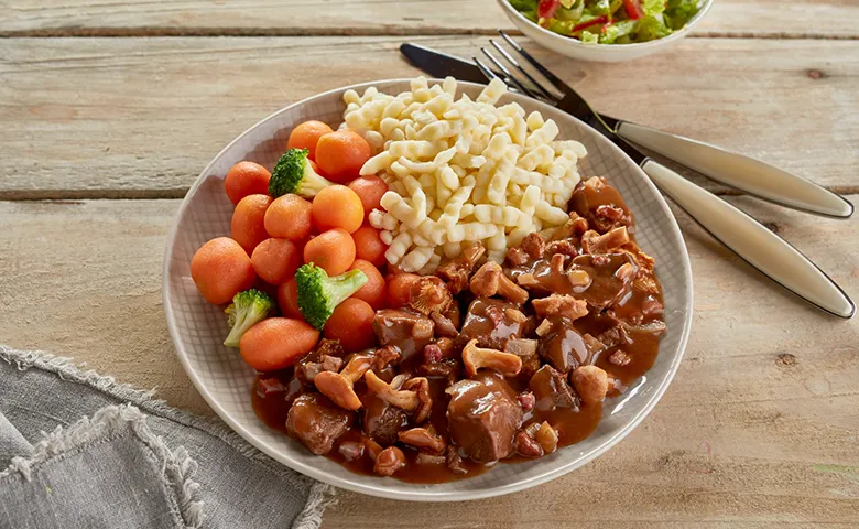 vom Rind und Schwein in einer Soße mit fein geschnittenen Champignons, dazu buntes Gemüse und Spiralnudeln