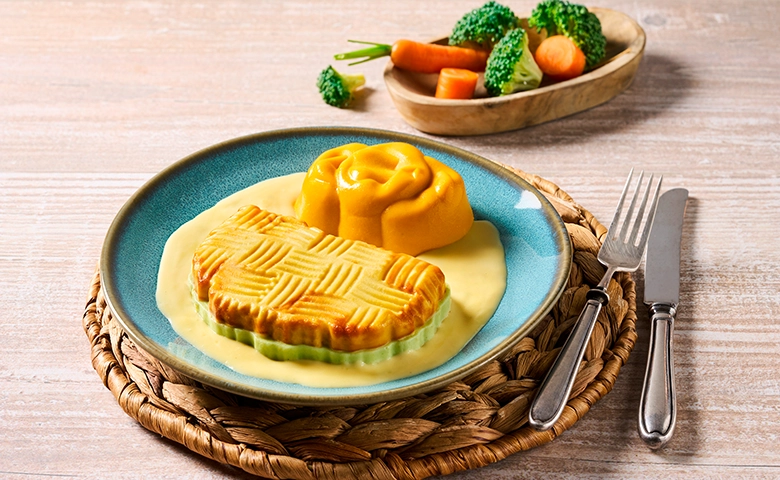 aus Hähnchenbrust-Formfleisch mit einer überbackenen Kartoffel-Gemüse-Pfanne