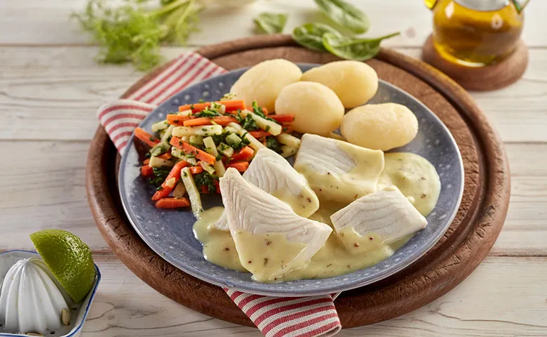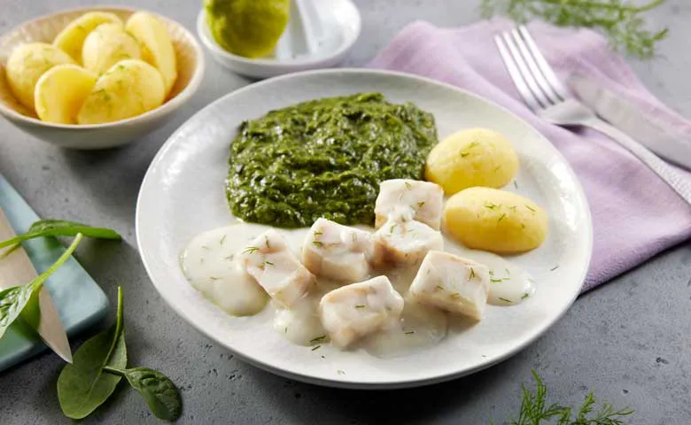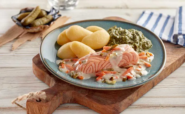 in Weißwein-Sahnesoße mit Spinat und Petersilienkartoffeln