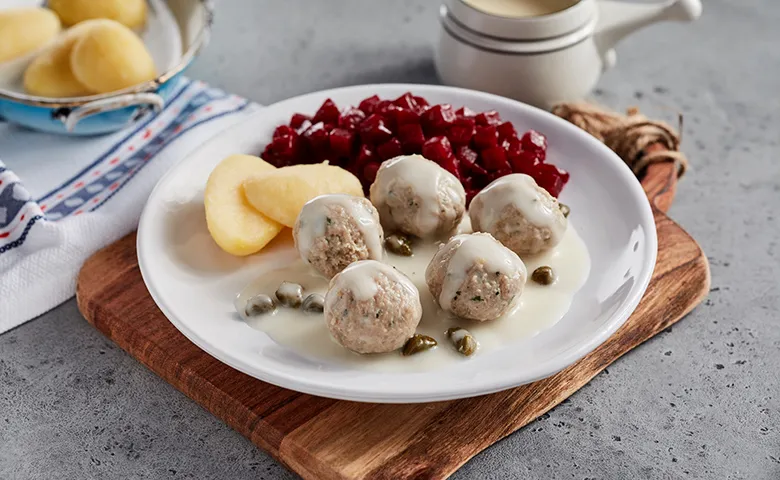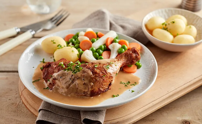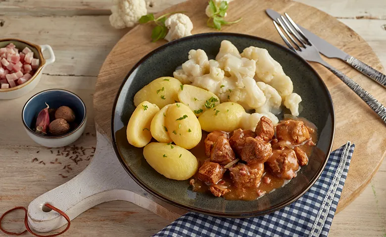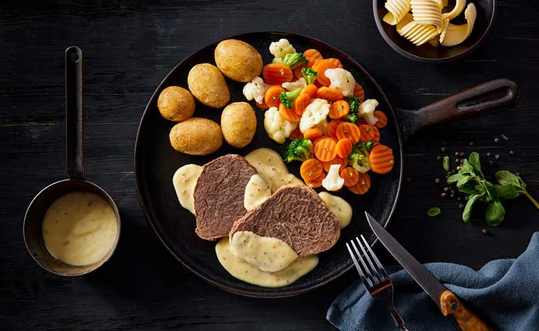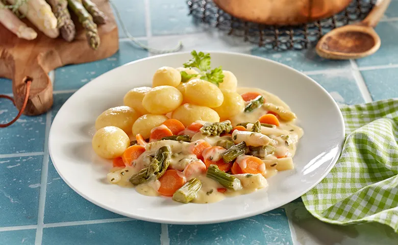 in einer feinen Soße mit Gemüse "Leipziger Allerlei" und Salzkartoffeln