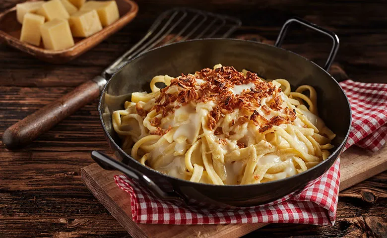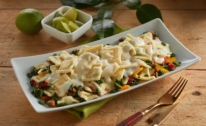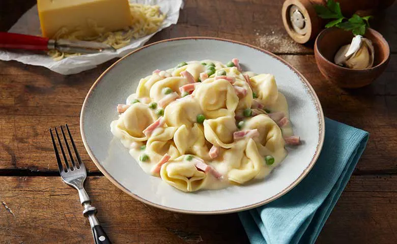 gefüllte Nudeln in cremiger Käsesoße, mit Pfifferlingen verfeinert