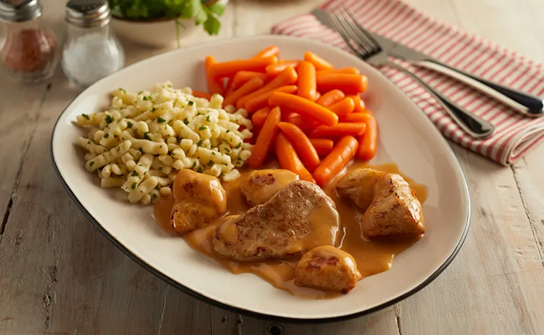 (Schweinemedaillon und Hähnchenfilets) in Feinschmeckersoße, dazu Fingermöhren und Kräuterspätzle