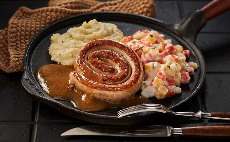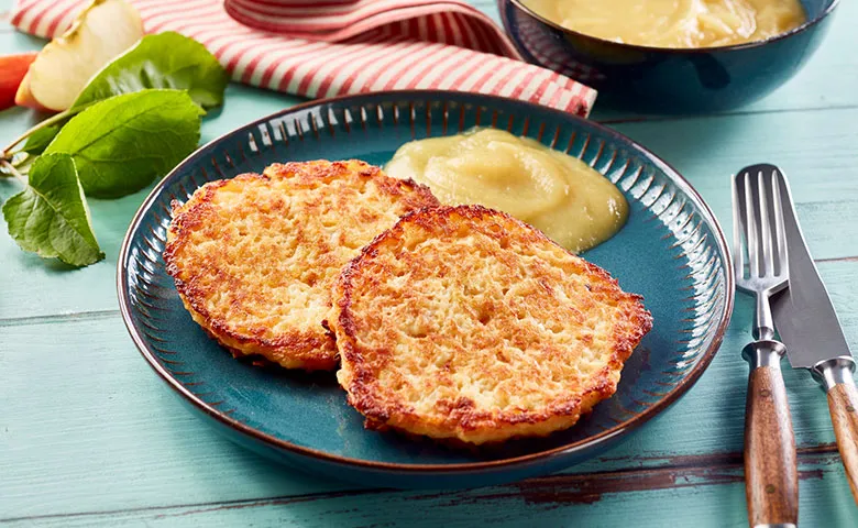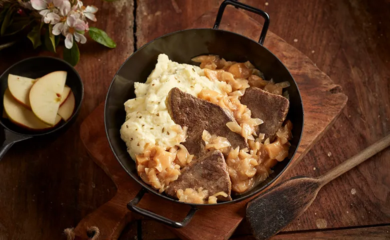 mit fruchtiger Apfel-Zwiebel-Garnitur, dazu Stampfkartoffeln