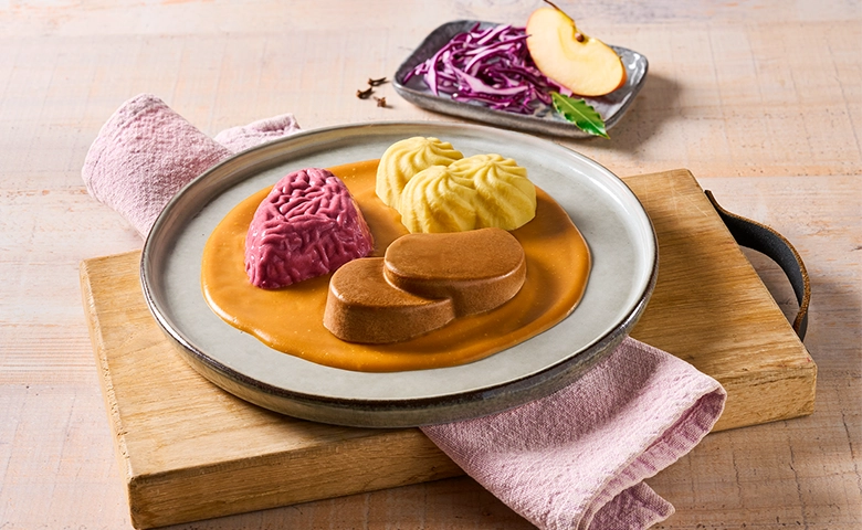 mit püriertem Rotkohl und Stampfkartoffeln