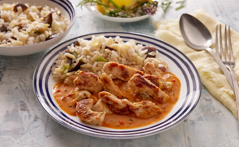 mit gebratenen Hähnchenstreifen und Paprika