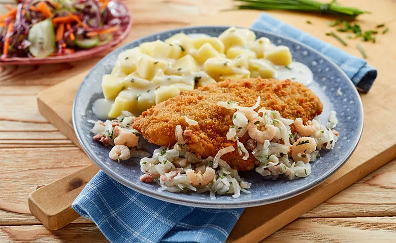 garniert mit Speck und Shrimps, dazu Rahmkartoffeln