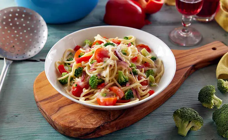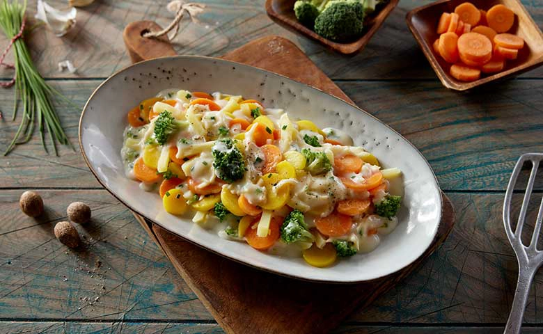 mit Brokkoli, Möhren und Zwiebeln in heller Soße, mit Käse überbacken