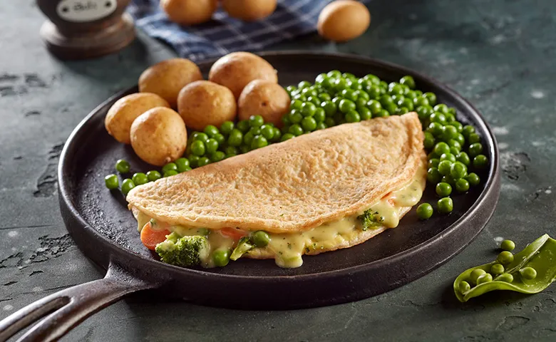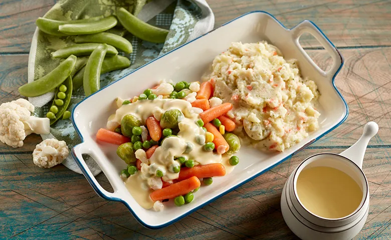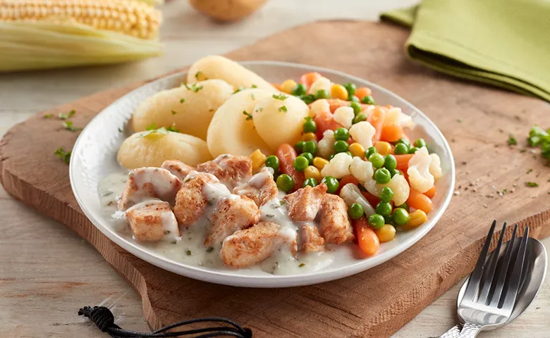 mit buntem Mischgemüse "naturell" und Kartoffelwürfeln in Käsesoße