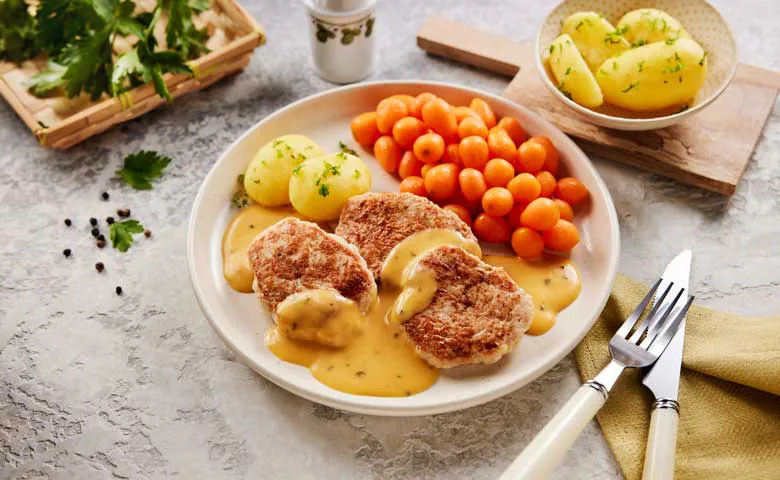 mit Möhren in Soße, dazu Petersilienkartoffeln