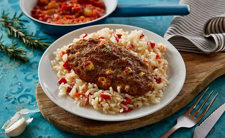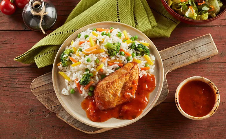 in fruchtiger Tomaten-Balsamico-Soße, dazu Gemüsereis