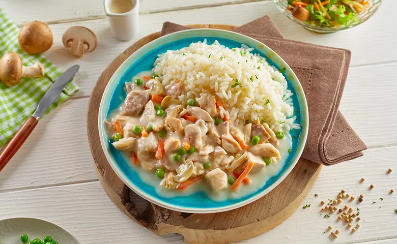 in Sahnesoße mit Gemüseeinlage, dazu Langkornreis