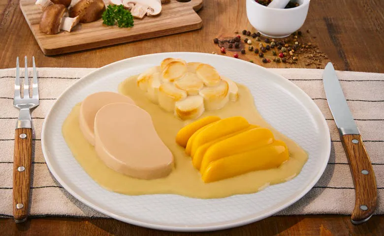 in Champignonsoße, dazu Gemüse "Leipziger Allerlei" und Kartoffelklöße