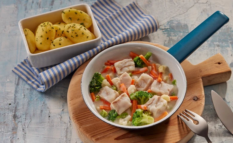 (aus nachhaltiger Fischwirtschaft)mit Gemüseeinlage und Salzkartoffeln