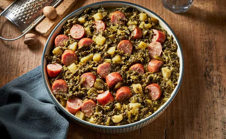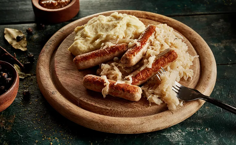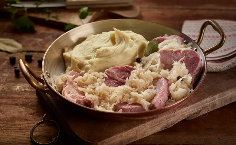 auf herzhaftem Sauerkraut, dazu Kartoffelpüree