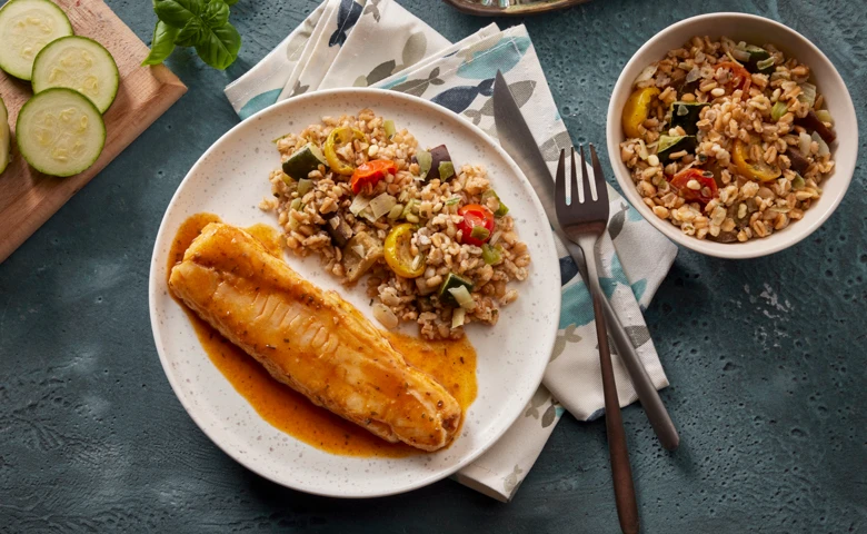 (aus nachhaltiger Fischwirtschaft) in Tomaten-Kräutermarinade, dazu eine Dinkel-Gemüse-Pfanne mit Tomate, Zucchini und Aubergine