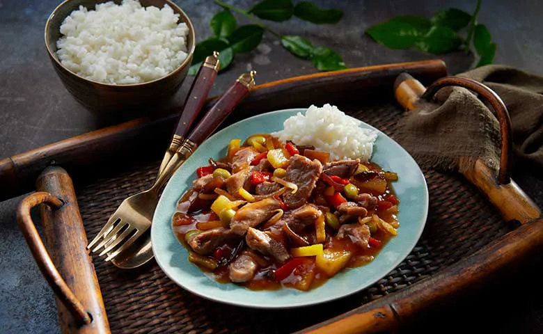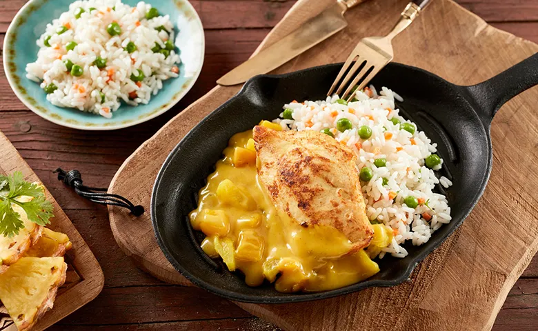 in Curry-Rahmsoße mit Pfirsichen und Ananas, dazu Gemüsereis