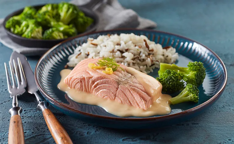 (aus verantwortungsvoller Aquakultur) mit Brokkoli und Herzoginkartoffeln