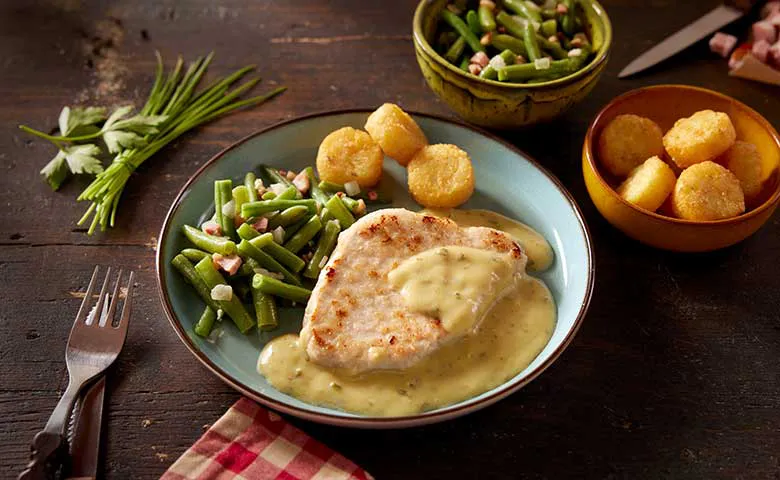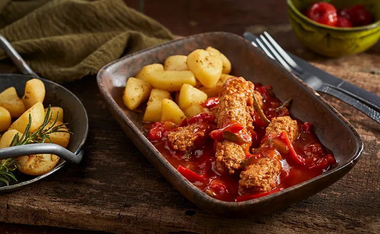 vom Schwein in pikanter Paprikasoße mit Kräuter-Kartoffeln