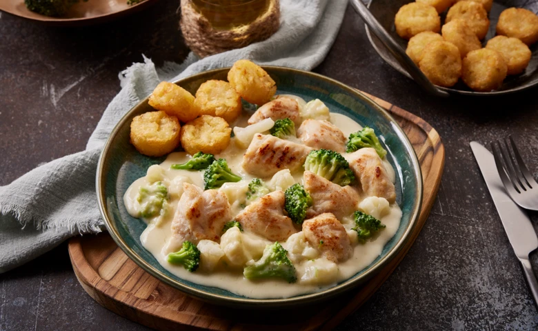 in einer Käsesoße mit Brokkoli- und Blumenkohlröschen, dazu Röstinchen
