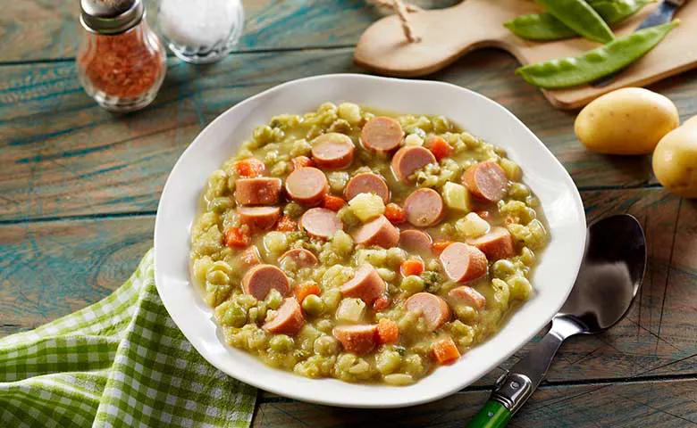 mit Erbsen und Möhren in Buttersoße, dazu Frühlingspüree