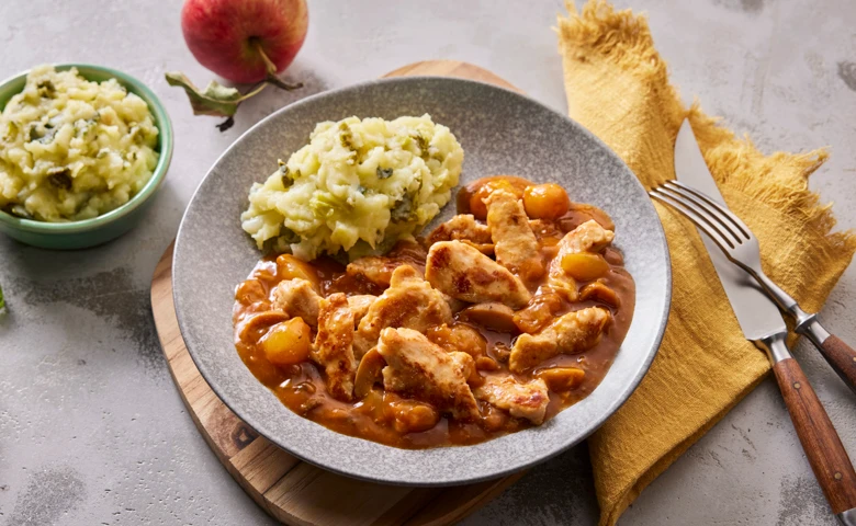 in feiner Soße mit einer Rosenkohl-Kartoffelpfanne