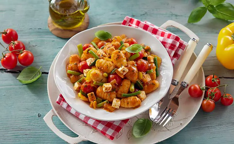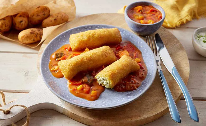 mit Frischkäsefüllung, dazu Gemüse in einer kräftigen Tomatensoße