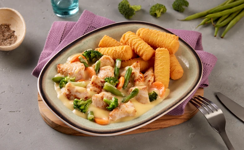 Hähnchenfiletstücke in einer feinen Schlemmersoße mit Möhren und Brokkoli, dazu Kroketten