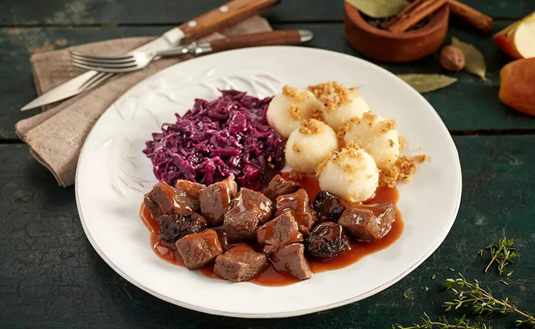 in feiner Rotweinsoße mit Pflaumen, dazu Rotkohl und Kartoffelklöße