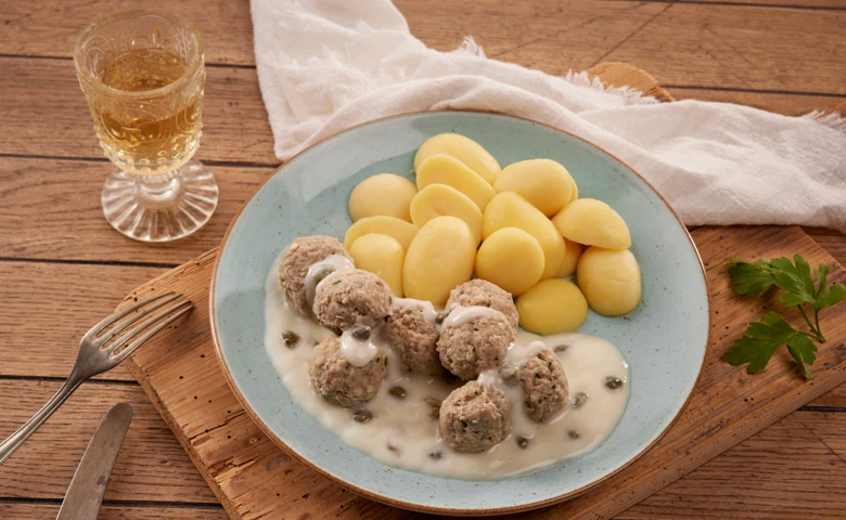 vom Schwein und Rind in cremiger Kapernsoße, dazu Salzkartoffeln